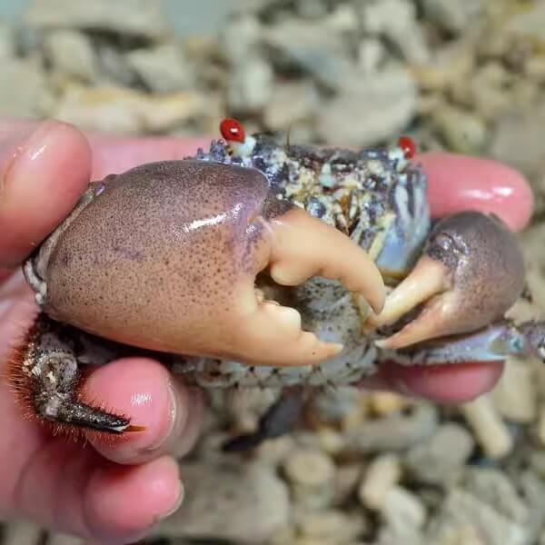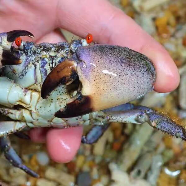 Features asymmetric claws—one larger, blunt for crushing, and a smaller sharper one for cutting.