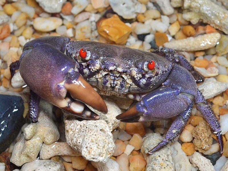 Feeds predominantly on other crustaceans and mollusks—its powerful claws can crush snail shells and hermit crabs.